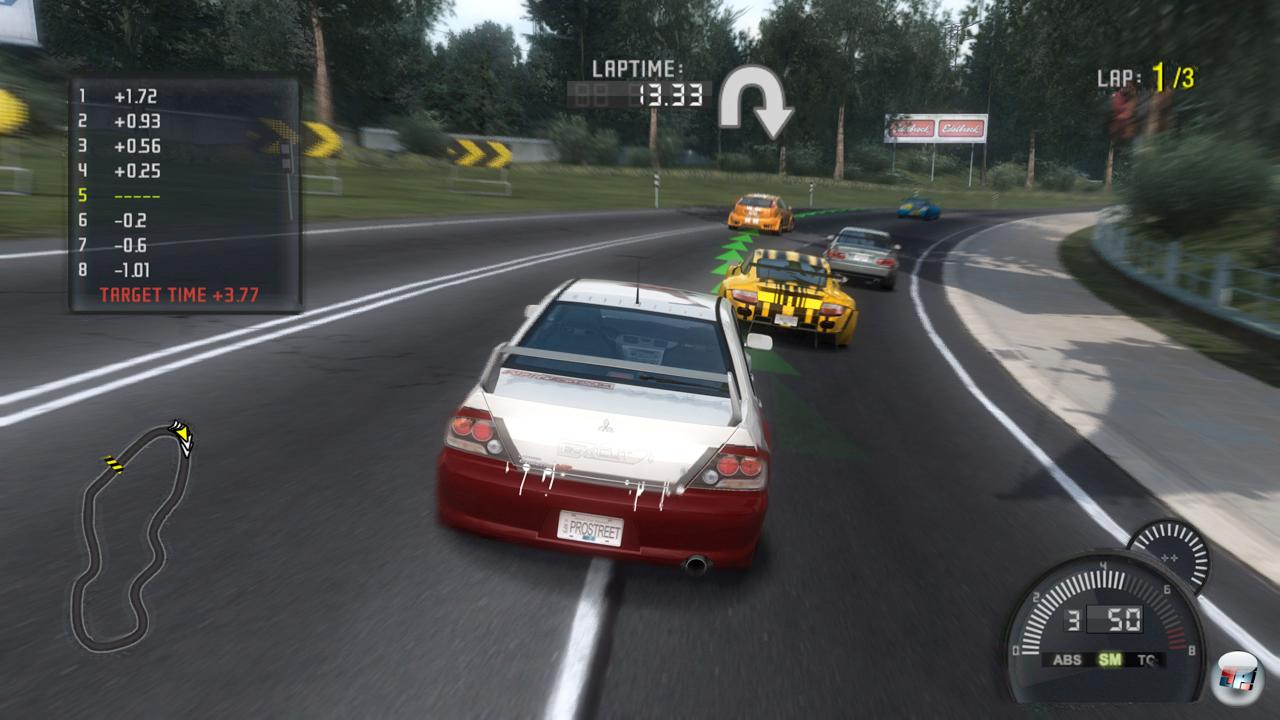 in Echtzeit erlebt, wie der Luftstrom über die Karosserie bläst. Tuning ist die eine Seite, ein richtiges Setup die andere. Deshalb habt ihr die Möglichkeit, viele Einstellungen vorzunehmen, sobald ihr euren Wagen mit entsprechenden Upgrades aufgerüstet habt. So verändert ihr z.B. die Getriebeübersetzung, stellt die Federhärte nach euren Wünschen ein oder bestimmt, ob euer Nitro eher kurz und heftig ausfällt oder doch besser über einen längeren Zeitraum genutzt wird, dafür aber keinen ganz so großen Geschwindigkeitsschub liefert. Doch auch bei den Einstellungen ist man von einer Simulation wie GTR 2 noch weit entfernt. So ist es z.B. nicht möglich, die Fahrzeughöhe für die Front und das Heck separat zu regeln – hier gibt es lediglich eine Einheitseinstellung. Gut, es gibt Schlimmeres und für einen Titel aus der NfS-Reihe bietet Pro Street hier verhältnismäßig viele Möglichkeiten. Zwar gibt es keinen separaten Testkurs, doch bekommt ihr bei Veranstaltungen zumindest vor den Rennen die Möglichkeit zu Probeläufen, bei denen ihr die Einstellungen noch mal abstimmen könnt – nur bei den Challenge-Events, bei denen ihr Wagen gestellt bekommt, sind Setup-Änderungen nicht möglich.