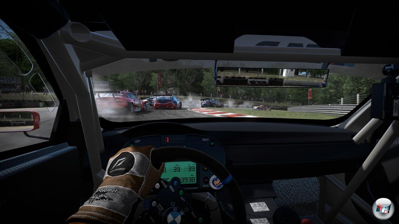 Besonders die Cockpitansicht hat es in sich: Die Armaturen und Innenausstattung der etwa 70 Fahrzeuge wurden nicht nur bis ins kleinste Detail nachmodelliert, sondern bei hohen Geschwindigkeiten wird zudem der Tunnelblick des Fahrers simuliert, indem über alles abseits der Strecke ein zunehmender Unschärfefilter gelegt wird – ein toller grafischer Effekt. Besonders dramatisch werden auch Unfälle inszeniert, die man hier so intensiv erlebt wie in keinem anderen Rennspiel, wenn man ordentlich durchgeschüttelt wird und das Herz des Alter Egos hinter dem Steuer unter schweren Atemgeräuschen wild pocht. Doch auch von außen machen die Boliden einiges her, obwohl die Aufkleber in der Nahansicht schnell aufpixeln und verwaschen wirken. Davon abgesehen wurden die Flitzer aufwändig gestaltet und auch die Spiegelungen auf den Karosserien sehen traumhaft aus. Dafür halten sich allerdings die Details im Rück- und den beiden Außenspiegeln in Grenzen, was dazu führt, dass dort neben vielen Pop-Ups die Fahrzeuge der Verfolger schon mal ohne Räder erscheinen. Im eigentlichen Renngeschehen ploppen dagegen nur selten Objekte ins Bild, doch gerade auf großen Strecken wie der Nordschleife wird man neben der Piste oder am Horizont immer wieder Zeuge des plötzlichen Grafikaufbaus. Dies fällt aber genau so wenig ins Gewicht wie das vereinzelte Tearing, das auf dem PC im Gegensatz zu den Konsolen durch das Aktivieren der vertikalen Synchronisation vermieden werden kann.