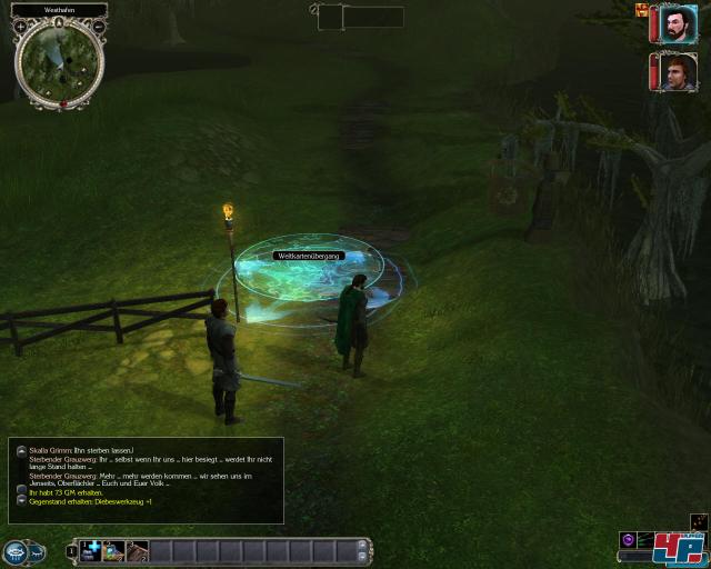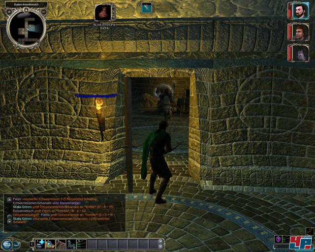 Außerdem wird man schon im Tutorial Bekanntschaft mit der Kamera machen, die immer wieder zu unglücklichen Wechseln oder Perspektiven neigt. Das Drehen und Zoomen hat zwar Vorteile, aber manchmal wünscht man sich fast eine altmodische Isosicht zurück. Immerhin könnt ihr auf einen Doppelklick schnell zu jeder Figur springen und diese sogar direkt über WSAD steuern – allerdings sieht die Spielwelt aus der Distanz weitaus besser aus. Wer hätte vor vier, fünf Jahren gedacht, dass Offline- Rollenspiele in Sachen Grafik den Kürzeren gegen Online-Rollenspiele ziehen würden? Schaut euch Guild Wars <a class="DYNLINK" onmouseover="DynToolTipp_Show('Klicken für Gameinfos‚)“ onmouseout=“DynToolTipp_Hide(); “ href=“javascript:DynCont_Display(‚Gamefinder‘,’runmod.php?sid=%7BSID%7D&LAYOUT=dyncont_gf&spielid=10247′)“> an und danach NN2, dann müsste der technische Graben deutlich werden.