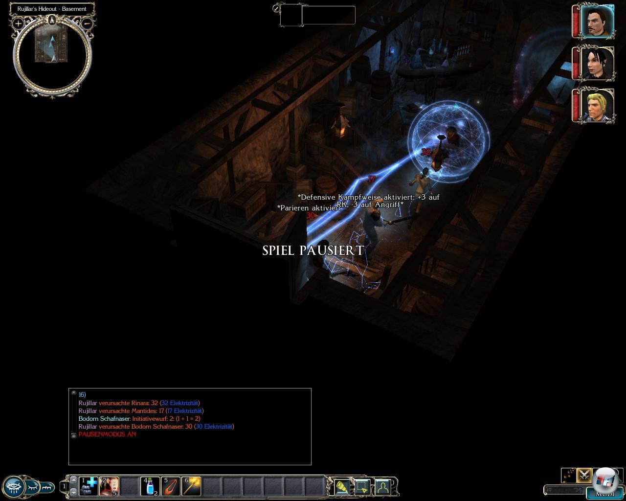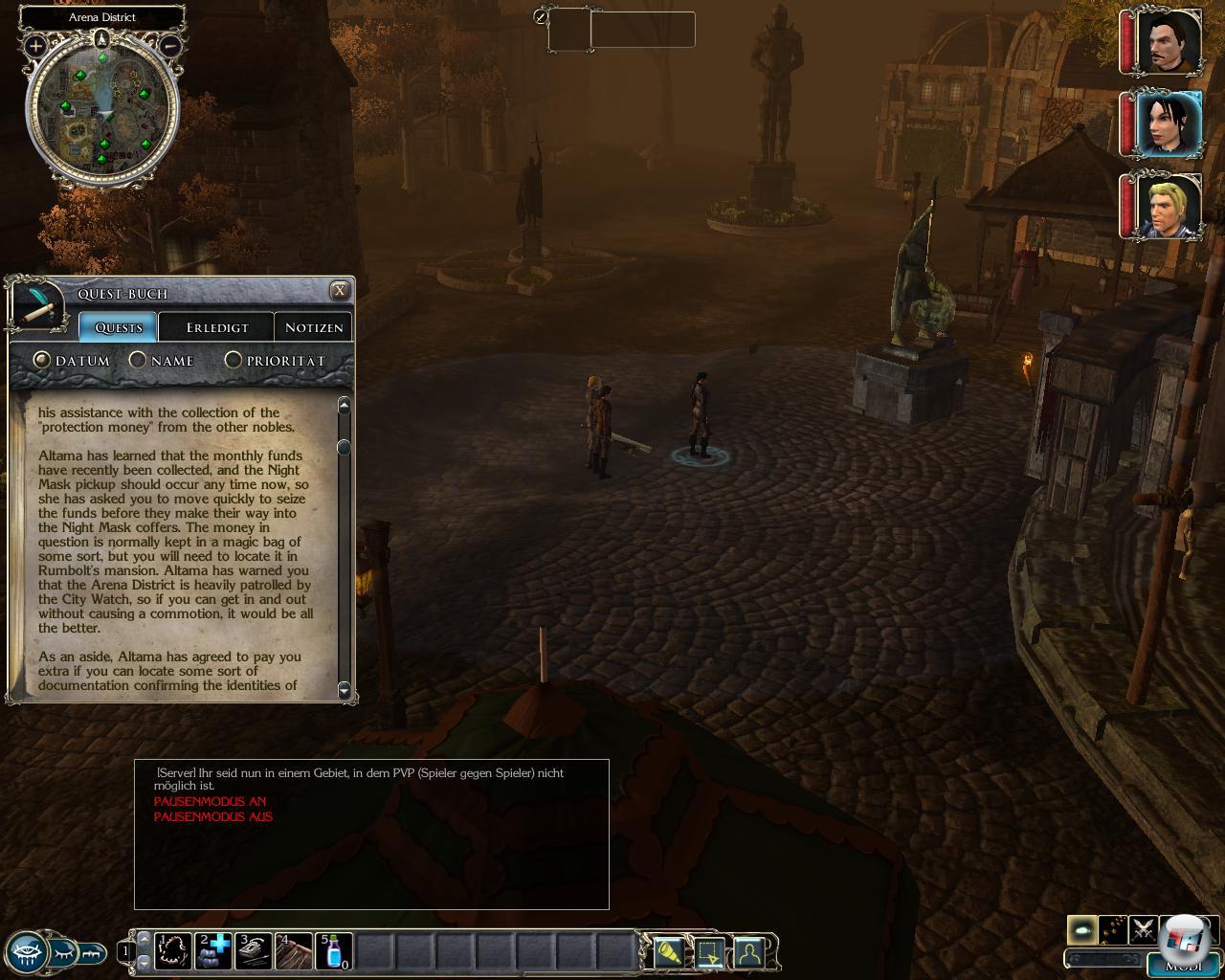 große Herausforderung. Zum einen ist es keine große Sache, die Ziele zu finden, die meist um die Ecke liegen. Die Wegfindung erfolgt allerdings quasi im Blindflug, da es in Westgate so zappenduster ist wie in einem Trollhintern – noch nie war das Talent Nachtsicht so wertvoll! Am gewünschten Haus angekommen, plättet man ein paar Feinde, wofür es schon Erfahrungspunkte gibt. Die Kämpfe sind leicht, auch weil man rasch potente Gefährten findet, die mitkämpfen. Man muss sich eigentlich nur in den Bosskämpfen bemühen, die man ab und an mit Magiern, Riesenspinnen oder Anführern ausficht. ![]()
