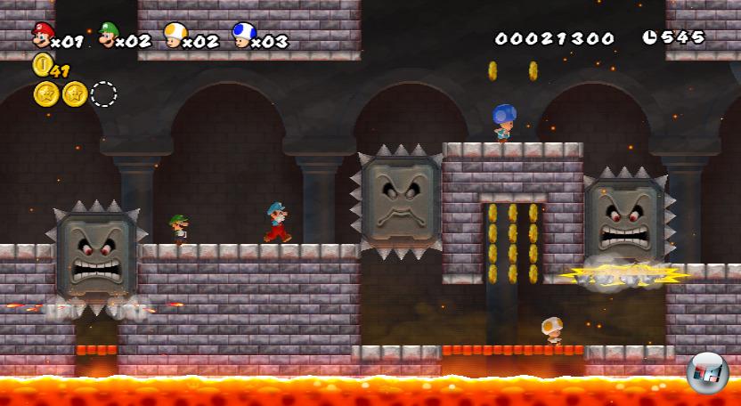 Mario und Luigi........4 freunde...man läuft und will über eine Levellücke springen und alle springen gleichzeitig, der Toad (blau) hüpft Toad (gelb) auf den Kopf und Toad (gelb) fliegt in die Lücke...Toad (blau) springt durch den Kopf noch ordentlich hoch und knallt gegen Mario und der kommt nicht mehr klar läuft gegen ein Gegner.... .