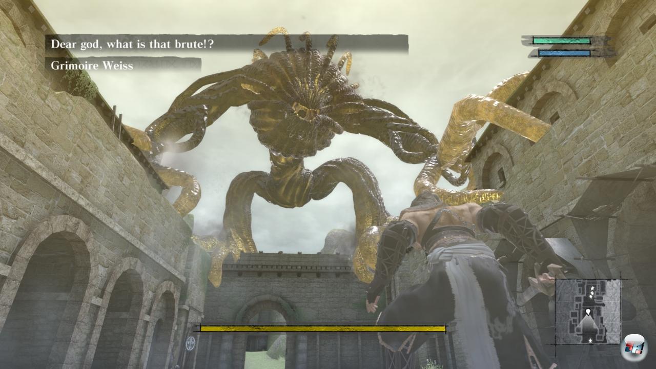 Allerdings muss man auch Nier seine visuellen Highlights zugestehen. Diese liegen zwar eher im Einsatz von Filtern und Effekten als im Bereich von Animationen, aber wie Cavia beim Umherstreifen durch die Welt mit dem Einsatz von Licht spielt, ist durchaus faszinierend. Gleißender Sonneneinfall wechselt sich z.B. ab mit klinischen, nur von kaltem Neonlicht bestrahlten Gewölben und sorgt damit für atmosphärische Nuancen. Und auch der Schwarz-Weiß-Filter im Herrenhaus überrascht und sorgt zusammen mit den meist festen Kameraeinstellungen, die an diesem Ort die ansonsten frei positionierbare Sichtposition ersetzen, fast schon für ein Resident Evil-Gefühl. Bei den teils Bildschirm füllenden Bossen sowie dem Gegnerdesign an sich überrascht der Titel auch mehr, als man ihm anfänglich zutrauen möchte. Die Schatten in ihren zahlreichen Variationen erinnern z.B. an eine Mischung ihrer Kollegen aus Ico sowie Figuren aus Tron, da ständig eine Art gelbe Matrix über ihren Körper läuft.