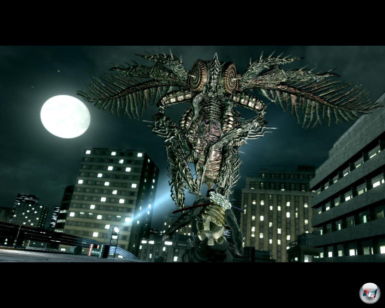 Angesichts vieler anderer guter Entscheidungen -und sei es auch nur die, ein bestimmtes Element aus diesem oder jenem Titel zu nehmen und in Ninja Blade einzubauen- fällt es mir schwer, einen Grund für dieses Speicherdesaster zu finden. Zumal auch hinsichtlich der Kulisse vieles richtig entschieden wurde. Im Detail neigen die Schauplätze zwar immer wieder zu matschigen Texturen sowie eintönigen Häuserfassaden, doch das wird durch das ausgefeilte Figurendesign sowie die effektvoll inszenierten Zwischensequenzen und QTEs weitestgehend wett gemacht, so dass sich letztlich alles auf einem ansehnlichen Niveau einpendelt. Angefangen von Ken als Hauptfigur, der bis auf wenige Ausnahmen sehr geschmeidig animiert seine Klingen durch die Gegner jagt, bis hin zum fantasievollen Design der vom Virus gezeichneten Monster, die mit überwältigender Mehrheit beunruhigende bis erschreckende insektenähnliche Züge tragen. Beispielhaft seien hier die bildschirmfüllenden Bosse erwähnt oder die „Insekten-Hubschrauber“, die wie schwer bewaffnete Libellen hinter einem her sind und einem alles abverlangen.