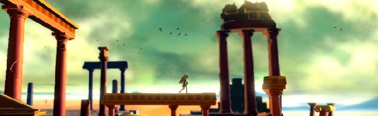 Bis hierher hört sich das alles genau so gewöhnlich an wie es sich auf den ersten Metern von links nach rechts spielt. Aber es sieht durchaus ungewöhnlich aus und fiel nicht nur damals in der Masse der kunterbunten WiiWare-Spiele, sondern auch heute im AppStore sofort auf: Die Kulisse besticht mit warmen Farben, langen Schattenwürfen, monumentalen Ruinen und bewegten Wolken im Hintergrund, so dass umgehend ein ebenso episches wie malerisches Flair entsteht. Dazu trägt auch die Story bei, die nicht nur mit mythischen Kreaturen und Zusammenhängen aufwartet, sondern auch über authentische Vasenmalerei transportiert wird. Schade ist nur, dass man diesem Stil hinsichtlich der Bauwerke und Farben etwas zu lang treu bleibt, so dass nach drei, vier Stunden Spielzeit eine gewisse grafische Monotonie aufkommt, die LostWinds oder Braid nicht so schnell plagte – erst, wenn die Nacht hereinbricht, wird der Schauplatz wieder interessanter und aufgrund der Lichtwirkung wieder unheimlich zauberhaft.
