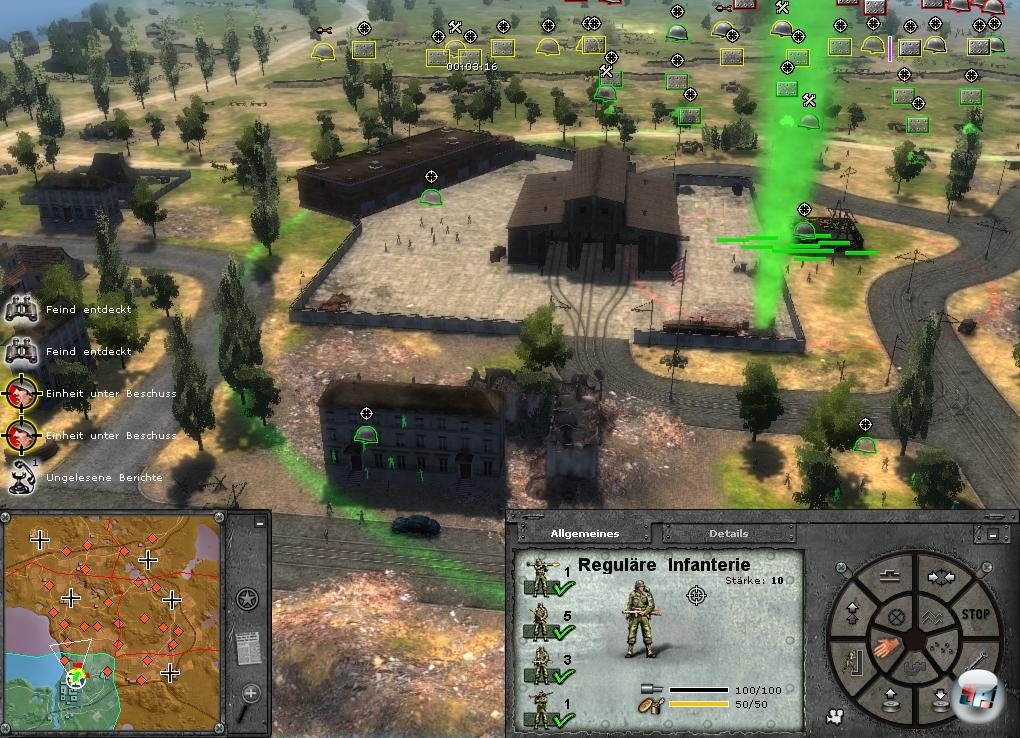 Die KI der eigenen Truppen ist eher durchwachsen. Eine gute Arbeit machen die eigenen GIs, die automatisch feuern, wenn ein Feind in Sichtweite kommt und in Reichweite ist. Dieses automatische Feuer lässt sich auf Wunsch auch abstellen, was nur eine der viele Funktionen wie Minen legen, reparieren und eingraben ist. Leider feuern sie aber nicht gezielt auf nur ein Feindfahrzeug, sondern jeder auf den Feind, der ihnen am nächsten ist. Will ich gezielt etwa einen Königstiger ausschalten, muss ich erst von Hand das Feuer der schwächeren Geschütze auf diesen bündeln. Langsam geht seine Anzeige so nach unten. Eher schlecht agieren die Verbündeten, die wie oben angesprochen verlustreiche Vorstöße ins Niemandsland riskieren. Das Vorgehen mit ihnen lässt sich leider nicht richtig koordinieren.