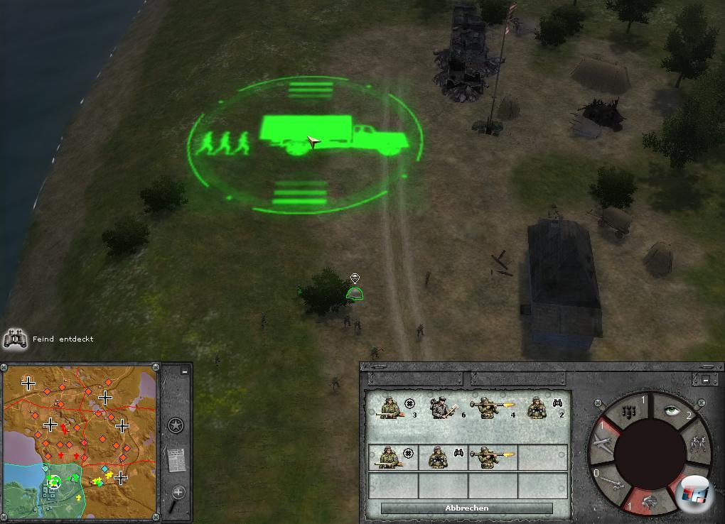 Das Besetzen von Feindfahrzeugen ist spätestens seit Blitzkrieg etwas, das in Spielen ziemlich regelmäßig vorkommt. So ist es auch in Officers, wo man verlassene Panzer, Fahrzeuge und Geschütze mitnehmen kann. Wann immer mir ein Gefährt gefällt, weil es das bei den Amis nicht gibt, dann lasse ich einfach aufsitzen und nehme es mit. Alles was ich dafür brauche, sind ein paar Leute aus einen Trupp Soldaten. Zusätzlich reparieren die Pioniere das erbeutete Fahrzeug rasch. Lukrativ ist das bei der deutschen Flak, der schicken Hummel-Selbstfahrlafette oder den schmucken Raketenwerfern, die überall an der Front rumstehen. Das war übrigens auch im Krieg völlig normal, weshalb es auch T-34 mit Hakenkreuzen und BMW-Motorräder mit aufgemaltem US-Stern gab.
