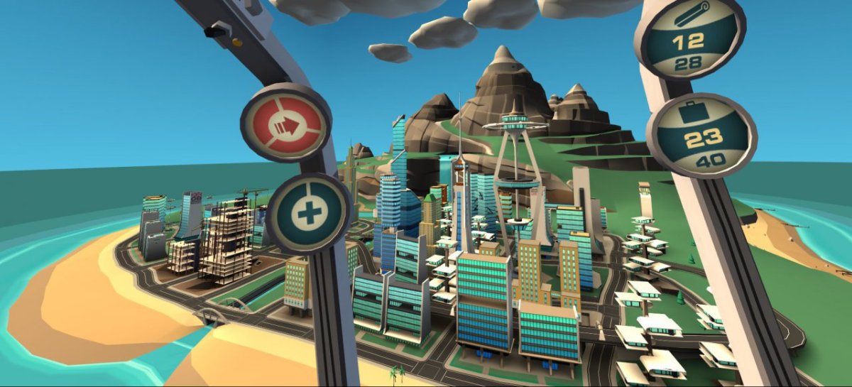 In meinen ersten Minuten als VR-Geheimagent war ich noch richtig euphorisch: Nach dem Briefing am übertrieben patriotisch dekorierten Schreibtisch konnte ich es kaum erwarten, die sonnige Insel endlich im Stil von Pilotwings aus der Luft zu erforschen und allerlei Zeitprüfungen mit und ohne Waffen zu bestehen. Vor dem Einsatz in der gefährlichen realen Welt schickt die Organisation Rekruten wie mich auf diese Trainingsinsel, um den Umgang mit ihrem wichtigsten Hilfsmittel – dem Jetpack – zu lernen. Die ersten Flugminuten fühlten sich tatsächlich erhebend an. Man sieht den klobig-eckigen Gebäuden und Bergen zwar ihre Herkunft vom Handy an (das Original erschien für Samsungs Headset Gear VR). Trotzdem hat mich die idyllische Sonneninsel mit ihren versteckten kleinen Grotten sofort zur Erkundung angespornt, zumal ich mich mit dem sauberen Tracking der HTC Vive schön realgetreu umschauen konnte. Doch die Freude währte nicht lange. Schon in den ersten Flugtests meldete sich immer wieder der Magen zu Wort: Ooops, das fühlte sich jetzt nicht so gut an, als ich mich mit Karacho in den versteckten Kern des Hochhauses fallen ließ. Auch bei einer blitzschnellen Wende zwischen einigen Ringen geraten die Augen und mein Gleichgewichtsorgan in einen gewaltigen Konflikt. Vor allem das seitliche Drehen mit dem Stick kann mein Magen überhaupt nicht leiden. Sicher – in den Steuerungs-Optionen gibt es einige alternativen Konzepte, bei denen ich mich z.B. auf Knopfdruck in Blickrichtung drehe, doch die meisten davon sorgen sogar für noch ein flaueres Gefühl.