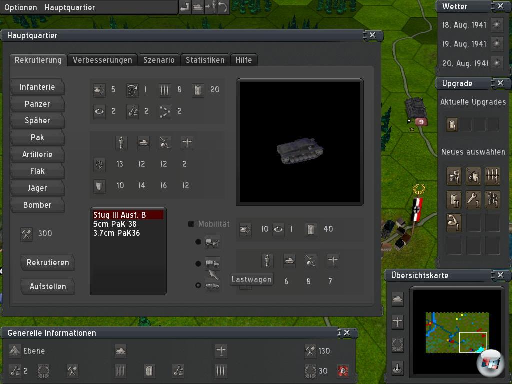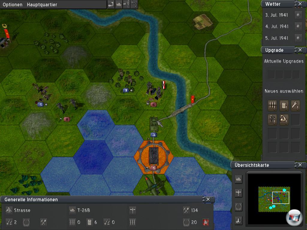 Die Gefechte sind hier bei weitem nicht so stahlhart, auch wenn es nominell drei Schwierigkeitsgrade gibt. Bereits in de ersten Schlacht um Polen konnte man im Klassiker scheitern, wenn man sich denn verzettelte. Das ist bei Operation Barbarossa nicht der Fall, denn hier sind die drei ersten Missionen quasi Freischüsse, bei denen auch der unbeleckteste Neuling wenig falsch machen kann. Es wird nicht bestraft, wenn man Panzer in Städten kämpfen lässt. Und große Ströme wie in den Ebenen Russlands lassen sich beinahe mühelos queren, so dass man keinen Brückenkopf einrichten muss. Ernüchternd kommt hinzu, dass die Schwierigkeitsgrade sich nicht spürbar unterschieden, so dass man es nicht schwerer machen kann.