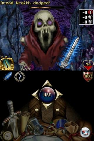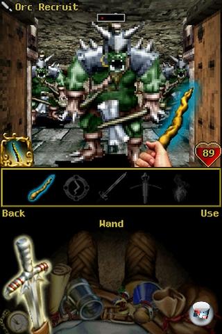 Der größte Schwachpunkt von O&E ist die Story: An sich sind die Texte um den erschreckend blass bleibenden Halbelf-Helden sowie seinen geschwätzigen Zauberstab zumindest ansatzweise interessant, die verwendete Sprache ist es dagegen nicht. Gut, keiner erwartet Tolkien, aber in einer Fantasy-Welt wirkt Bauarbeitersprache irgendwie fehl am Platze. Nun gut, nehmen wir die Story eben am Rande mit, denn viel wichtiger ist hier tatsächlich die Präsentation: Die 3D-Dungeons sind nett anzusehen, die Grafik ist flott und ruckelfrei, es gibt weitaus mehr Details und Effekte als auf dem Handy, die pixeligen Sprite-Gegner verbreiten einen wunderschönen Oldschool-Charme – aber sind natürlich nicht sehr zeitgemäß. Beide Bildschirme werden gut genutzt, auf dem oberen findet die Action statt, auf dem unteren tummeln sich wahlweise Automap, Intenvar-Gürtel und Hauptmenü. Und wenn man zuviel Zwergenbier intus hat, schwankt die Perspektive schwindelig machend in alle Richtungen…