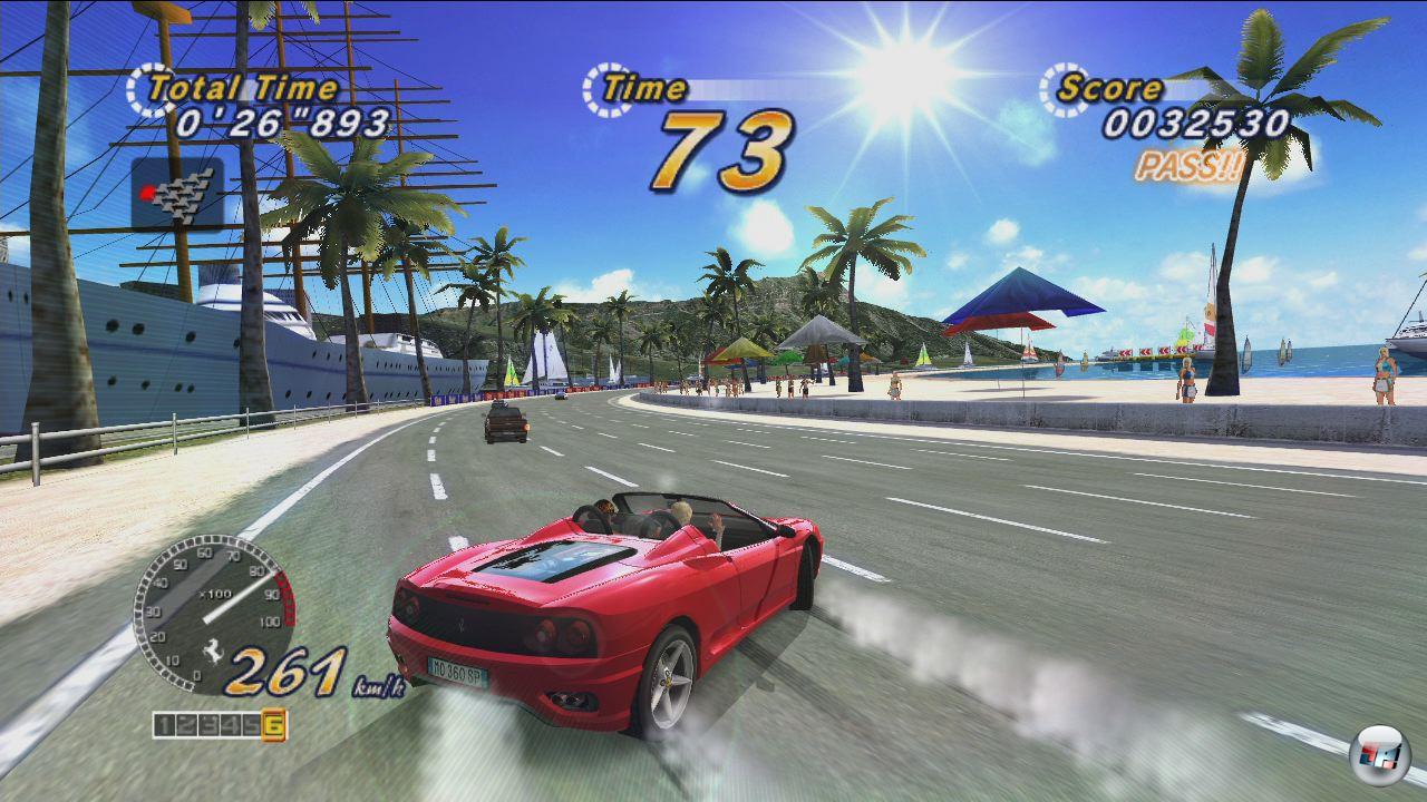 Die Beantwortung fällt leicht: Zum einen lassen sich die alten OutRuns nicht mehr online spielen – das gute alte Xbox Live ist genauso tot wie die dazu gehörige Konsole, was Ben, Michael und mich hart getroffen hat, haben wir OutRun 2006 doch oft online gespielt. Verdammt oft. Zum anderen sehen die Spiele auf der 360 überraschenderweise schlechter aus als auf dem Original-System; der Emulator versagt bitter. Und speziell an dieser Stelle gibt es keine Ausreden mehr: Erstaunlich, wie viel besser OutRun Online Arcade (OOA) aussieht als das ohnehin schon prachtvolle OutRun 2006 <a class="DYNLINK" onmouseover="DynToolTipp_Show('Klicken für Gameinfos‚)“ onmouseout=“DynToolTipp_Hide(); “ href=“javascript:DynCont_Display(‚Gamefinder‘,’runmod.php?sid=%7BSID%7D&LAYOUT=dyncont_gf&spielid=9139′)“>! Entwickler Sumo Digital hat nicht einfach den alten Code durch den HD-Konverter gejagt, sondern bemerkenswerte Detailarbeit geleistet. Resultat: Das mit Abstand schönste OutRun! Dem allerdings etwas Anti-Aliasing gut getan hätte – auf der anderen Seite wird die rasante Punktehatz auch so schon gelegentlich langsamer (besonders im Herzinfarkt-Modus).