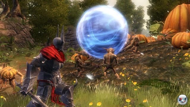 Erst draußen diese märchenhafte Idylle, die mit ihren Lichtschächten, schummrigen Wäldern und leuchtenden Feldern an Fable <a class="DYNLINK" onmouseover="DynToolTipp_Show('Klicken für Gameinfos‚)“ onmouseout=“DynToolTipp_Hide(); “ href=“javascript:DynCont_Display(‚Gamefinder‘,’runmod.php?sid=%7BSID%7D&LAYOUT=dyncont_gf&spielid=1618′)“> erinnert und zig Kreaturen von klassisch bis bizarr aufmarschieren lässt: Es gibt Trolle, Irrlichter, Zombies, Succubi, Einhörner, Minotauren, Rattenwesen, Faune, Granatgänse. Und jetzt drinnen dieses polternde Chaos, wo es in zig Farben spritzt, platzt und scheppert. Alles übrigens bis auf die hüftsteifen Schritte meiner Overlordfigur butterweich animiert, stilistisch ein wenig an World of WarCraft <a class="DYNLINK" onmouseover="DynToolTipp_Show('Klicken für Gameinfos‚)“ onmouseout=“DynToolTipp_Hide(); “ href=“javascript:DynCont_Display(‚Gamefinder‘,’runmod.php?sid=%7BSID%7D&LAYOUT=dyncont_gf&spielid=1952′)“> erinnernd [oder sind die Zwerge etwa eine 1:1-Kopie? Nein, nein…] und dank sanftem Tag- & Nachtwechsel sogar bei Abendrot genießbar. Diese Fantasykulisse hat mich spätestens im düsteren Elfensumpf verzaubert, wo mich wabernde Wurzelstränge und tiefgrüne Tümpel begrüßen, während ein Einhorn sein blutiges Maul in einen Zwergenkadaver taucht – köstlich.
