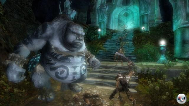 Ansonsten läuft der Alltag als Overlord komfortabel ab: Man kann jeden Feind mit der Schultertaste fixieren und dann einen Zauber sprechen. Neben dem klassischen Gebrutzel kommen später noch Schildmagie und die Stärkung der Kampfkraft hinzu – vielleicht etwas wenig auf lange Sicht. Dafür dürft ihr im Turm fleißig Waffen und Rüstungen schmieden. Dazu schmeißt ihr Untertanen in die Esse, die z.B. eurer Axt je nach Farbe andere Boni verleihen. Waren genug grüne Schergen opferwillig, leuchtet die Schneide ebenso und ihr verursacht größeren Schaden.