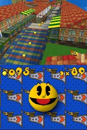 Gelbe Kullerkugel Die von etwas nervender Baby-Geplärre-Sprachausgabe vorgetragene Story könnte kaum alberner sein: Der noch in Ausbildung befindliche jugendliche Pac-Man arbeitet sich unter dem legendären Pac-Master die Karriereleiter nach oben und versucht, das Pac-Girl (und zukünftige Mrs. Pac-Man) zu becircen. Doch die doofen Geister wollten der Pac-Harmonie ein für allemal ein Ende bereiten und erweckten Golvis, den bösen Rock-n-Roll-Geist zum Leben, den selbst der Pac-Master mit Powerpille nicht schlagen konnte. Alles und jeder im Pac-Land wird eingefroren – außer Pac-Man, den eine Fee retten konnte. Zeit, mal wieder die Welt zu retten. Das macht ihr mit dem Stylus: Pac-Man befindet sich in einer 3D-Welt, durch die ihr ihn mit gezielten Touchpad-Strichen steuert. Je nach Länge und Geschwindigkeit eurer Malkünste rollert Pac-Man um Kurven, beschleunigt oder bremst abrupt. Unter Beachtung der Physik weicht ihr Hindernissen aus, überwindet Sprungpassagen, zerstört Kisten und mampft natürlich tonnenweise gelbe Pillen. Von denen wird immer eine bestimmte Anzahl gebraucht, um von Golvis versperrte Tore wieder zu öffnen. Leicht wie eine Feder Kein Pac-Man-Spiel ohne Geister: Die Lakenträger schwirren in den meisten der gut 30 Levels herum, immer auf der Jagd nach unserem Helden. Ihr könnt ihnen entweder aus dem Weg rollen oder seltene rote Power-Pillen schnurpsen – zack, schon macht ihr kurzzeitig Jagd auf sie! Werdet ihr erwischt, könnt ihr per schneller Stylus-Tipperei die Übelwichter loswerden – klappt das nicht, verliert ihr ein Leben. Diverse Items erleichtern oder erschweren euer Leben: Ein Ritterhelm lässt euch unter Wasser sinken, eine Feder über Wasser gleiten – aber so leicht werdet ihr auch schneller vom Wind weggeweht. Außerdem gibt es viele Juwelen zu finden, die nicht nur Challenge-Modi (dieselben Levels, aber mit spezifischen Aufgaben), sondern auch die Original-Version von Pac-Man freischalten. Die sechs Welten sind thematisch sehr verschieden: Ihr kullert u.a. durch einen Dschungel, ein Zuckerland oder eine Flammenfestung – am Ende wartet jeweils Golvis auf eine nicht besonders aufregende Abrechnung. Optisch bietet das Spiel nichts Besonderes: sehr simple 3D-Levels mit ein paar netten Effekten und einem witzig animierten Pac-Man auf dem unteren Screen, dazu gut hörbare Musik. | Fakten: – sechs Welten Pro / Kontra: + gut für Zwischendurch geeignet – sehr simple Grafik |