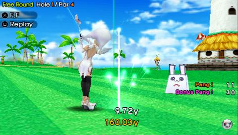 Und auch sonst macht Pangya wesentlich mehr richtig als mir nach einem Blick auf die PC-Version schwante. Ganz richtig: Pangya hat nicht nur als Wii-Titel, sondern zuvor bereits als Online-Spiel einige Jahre auf dem Buckel, drehte sich als solches aber hauptsächlich um das internette Gegen- und Miteinander. Umso seltsamer, dass die PSP-Entwicklung auf eine Online-Anbindung verzichtet – auch hier ist der direkte Konkurrent Everybody’s Golf einen Schritt weiter. Immerhin dürfen sich aber bis zu acht lokale Teilnehmer um die meisten Punkte unter Par rangeln oder als Teams in den Wettstreit treten. Wo PC-Golfer zudem in die Soloröhre gucken, bietet die Handheld-Fassung nicht nur den Story-Modus, in dem sich alles um das direkte Duell dreht. Vielmehr wartet auch ein umfangreicher Turniermodus, für den ich mir erst Lizenzen erspielen muss, bevor ich auf den entsprechenden Kursen an Meisterschaften teilnehmen darf. Für eine Lizenz gilt es dabei, wechselnde Herausforderungen – vom Einlochen mit nur einem Schlag über einfache Punktspiele bis hin zum Versuch, möglichst nahe ans Loch zu schlagen – zu meistern. Hat man ausreichend Punkte gesammelt, wartet schließlich eine Vielzahl unterschiedlicher Turniere und Preisgelder auf den ambitionierten Karrieristen.