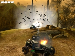 so dass umfangreichere Gefechte abplatzende Gemäuerstücke und bröckelnden Beton nach sich ziehen. Teilweise haben die Entwickler die Effekte allerdings nicht im Griff: So verzerren die Glasscheiben auch Teile der Vordergrundgrafik mit, was ebenso albern aussieht wie wenig Sinn ergibt. Außerdem ist der Rest der Optik mau: Neben erwähnten peinlichen Zwischensequenzen sind es vor allem die Animationen, die mit ihrer Stockhaftigkeit in einem modernen Shooter eigentlich nichts mehr verloren haben. Immerhin wird das Havok-Physiksystem genutzt, welches nach Explosionen für herumfliegende Körper und Gegenstände sorgt. Trotz einer 18er-Einstufung geizt Pariah übrigens mit Schock-Effekten: kaum Blut, kein Gore – damit lockt man keinen Space Marine hinter seinem Hellknight hervor.Habt ihr genug Klongegner erledigt, wartet noch der Mehrspielermodus: Bis zu 16 Recken dürfen sich via Xbox Live oder System Link die Hucke zerkratzen, Spielmodi wie (Team) Deathmatch, Capture the Flag oder Siege spulen ihre Aufgabe allerdings etwas sehr routiniert ab. Immerhin gewinnen die Fahrzeuge auf den teilweise sehr schön designten Karten an Bedeutung, außerdem darf ein zweiter Spieler jederzeit kooperativ in den Singleplayermodus eingreifen, der daraufhin horizontal zweigeteilt abläuft. Die Soundfront ist in Pariah ein zweischneidiges Schwert: Die etwas hornlastige Musik