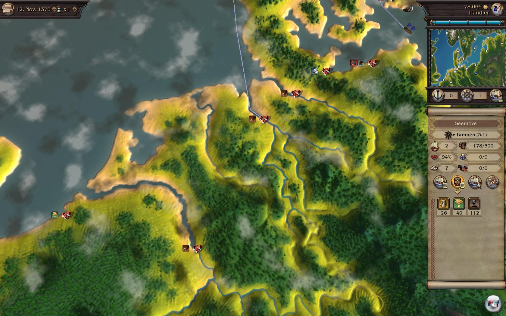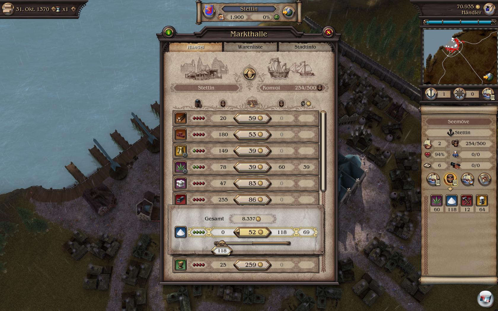 so dass man nicht mehr so lange braucht, bis sich der Geldbeutel spannt. Zwar gibt es immer noch dieselben Waren und Handelsstädte wie beim Vorgänger, aber selbst kürzere Fahrten lassen die Kasse klingeln. Man kann zwar immer noch Felle von Nowgorod nach Hamburg fahren, was auch viel einbringt. Meist reicht es aber, wenn man sich anschaut, was eine Stadt produziert und was sie benötigt. So fehlt in London fast immer Wolle, in Lübeck Holz und in Stockholm wird viel Bier getrunken. Auf der anderen Seite wollen alle Salz, Met und Korn, so dass man einträgliche Routen planen kann. Wem das ewige Hin und her zu mühsam ist, der kann seine Schiffe auch automatisch fahren lassen, was allerdings ein wenig komplex zum Einstellen ist.