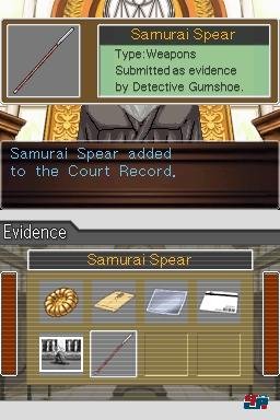 Ihr müsst euch als junger Anwalt vor dem Richter und gegen den Staatsanwalt beweisen, indem ihr Beweise vorlegt, Falschaussagen entlarvt und Zeugen die Wahrheit entlockt. Falls ihr Lust habt, könnt ihr in den Verhandlungen auch „Einspruch“ ins Mikro brüllen – ansonsten werden Stylus und Doppeldbildschirm konventionell genutzt. Wie in einem Adventure könnt ihr Tatorte besuchen und per Fadenkreuz auf dem Touchscreen an Beweise zoomen, die euch später im Prozess helfen: Etwa eine Wanze im Hotelzimmer der wichtigsten Zeugin, ein Blut verschmierter Zettel oder eine letzte Nachricht des Opfers auf dem Handy.