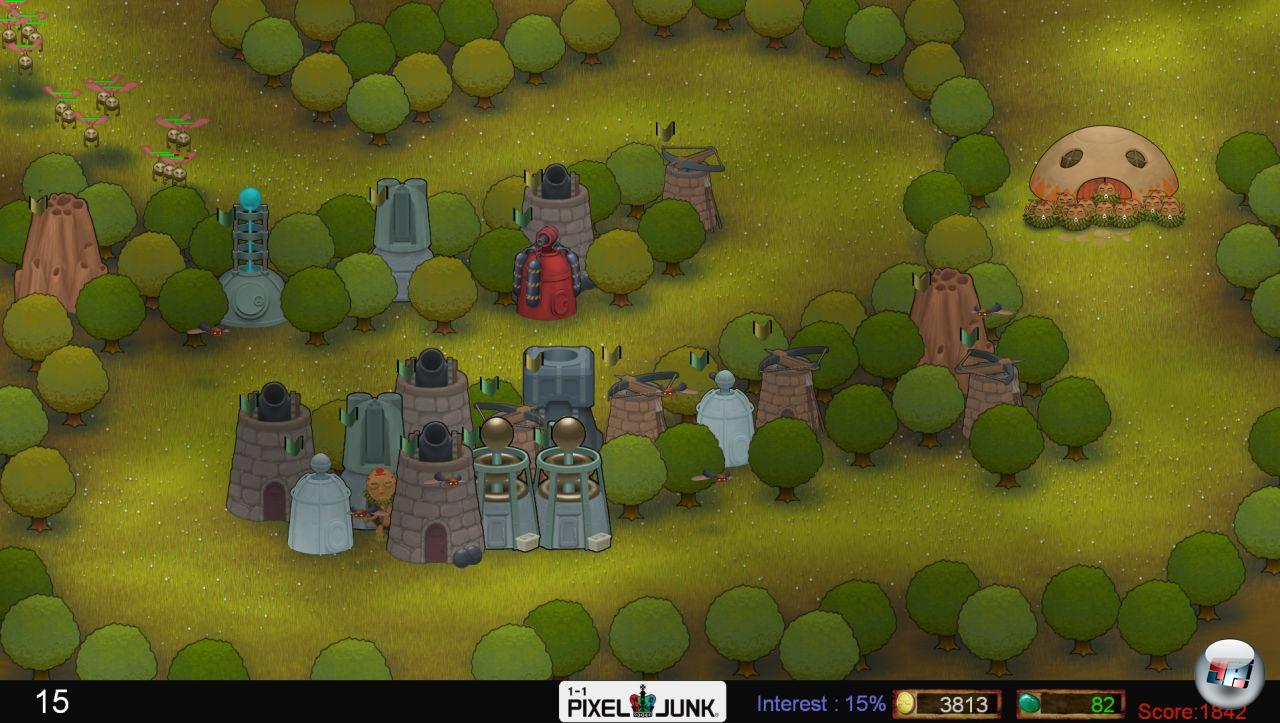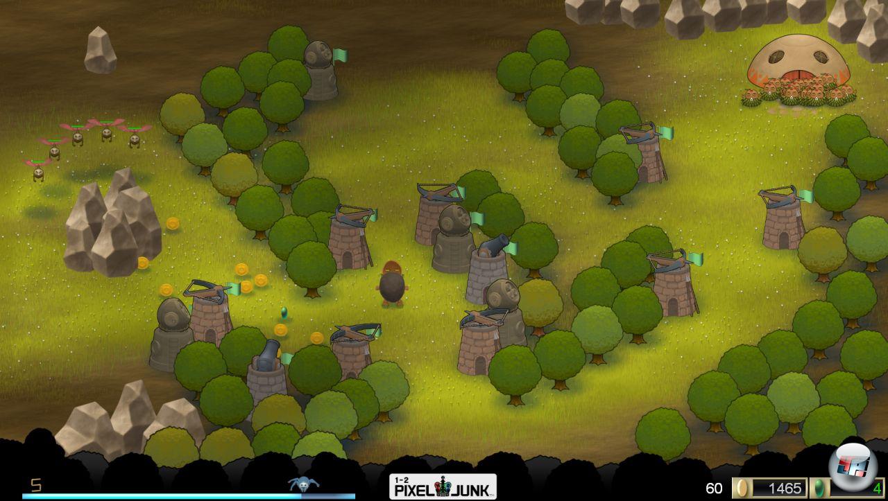 Wie bei allen Tower Denfence-Spielen dreht sich auch bei Pixeljunk Monsters alles um das Platzieren und Aufrüsten von Abwehranlagen, mit denen ihr versucht, feindliche Angriffswellen auszulöschen, bevor diese eure Basis erreichen. Insgesamt habt ihr die Wahl zwischen zehn unterschiedlichen Turmbauten, die je nach Gegnerart und -anzahl verschieden effektiv sind. Kanonen, Mörser und Teslaspulen richten zwar großen Schaden an, brauchen aber lange zum Nachladen und sind gegen fliegende Angreifer wirkungslos.