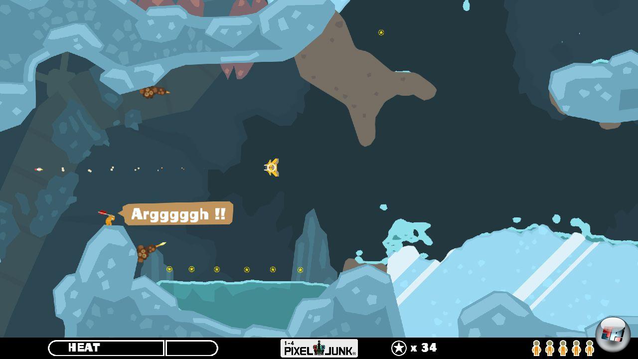Überhaupt fühlte ich mich während des gesamten Spiels so entspannt wie schon lange nicht mehr: Die Eishöhlen und Bergwerke könnten zwar etwas detaillierter gezeichnet sein, doch das schlichte Design passt zum minimalistischen Stil von Q-Games. Auch der stets faire Schwierigkeitsgrad sowie der hypnotische Triphop-Soundtrack sorgen für relaxtes Erkunden. Wenn ein agressives Rudel Gegner auf dem Bildschirm auftaucht, wird die ruhige Musik manchmal sogar von dramatischen Schlagzeugsoli unterbrochen. All zu viele Raketen darf ich den feindlichen Viechern übrigens nicht entgegen jagen, denn das erhöht die Temperatur meines Gleiters. Wenn mich danach noch ein Projektil trifft, trudele ich bewegungsunfähig gen Höhlengrund und zerschelle. Mit ein wenig Glück lande ich aber in einem kühlen Wasserbecken und bin sofort wieder im Spiel. In der Nähe der großen Lavabecken darf ich mich ebenfalls nicht zu lange aufhalten, während ich Raketen abfeuere.