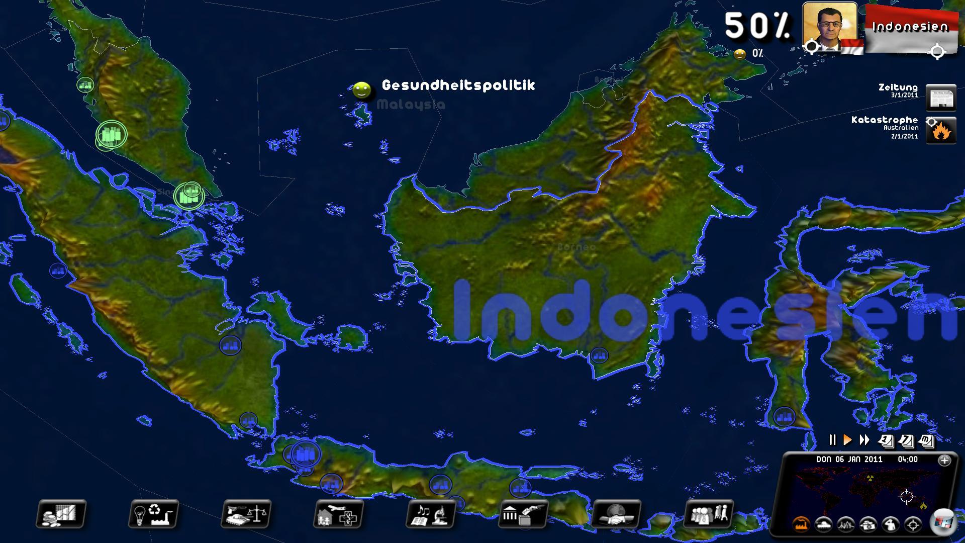 Zwar kann man hier Bundeskanzlerin, iranischer Staatschef oder amerikanischer Präsident sein, aber das ist in etwa so prickelnd wie zuletzt beim St. Pauli Manager einen Puff zu managen. Zumal der noch leidlich witzig war, was der politischen Simulation völlig fehlt. Das unübersichtliche Strategiespiel könnte auch als Tabellenkalkulation durchgehen. Daran ändert auch die Weltkarte nichts, bei der man zwar ganz runter scrollen kann, aber eigentlich nichts Wichtiges findet.
