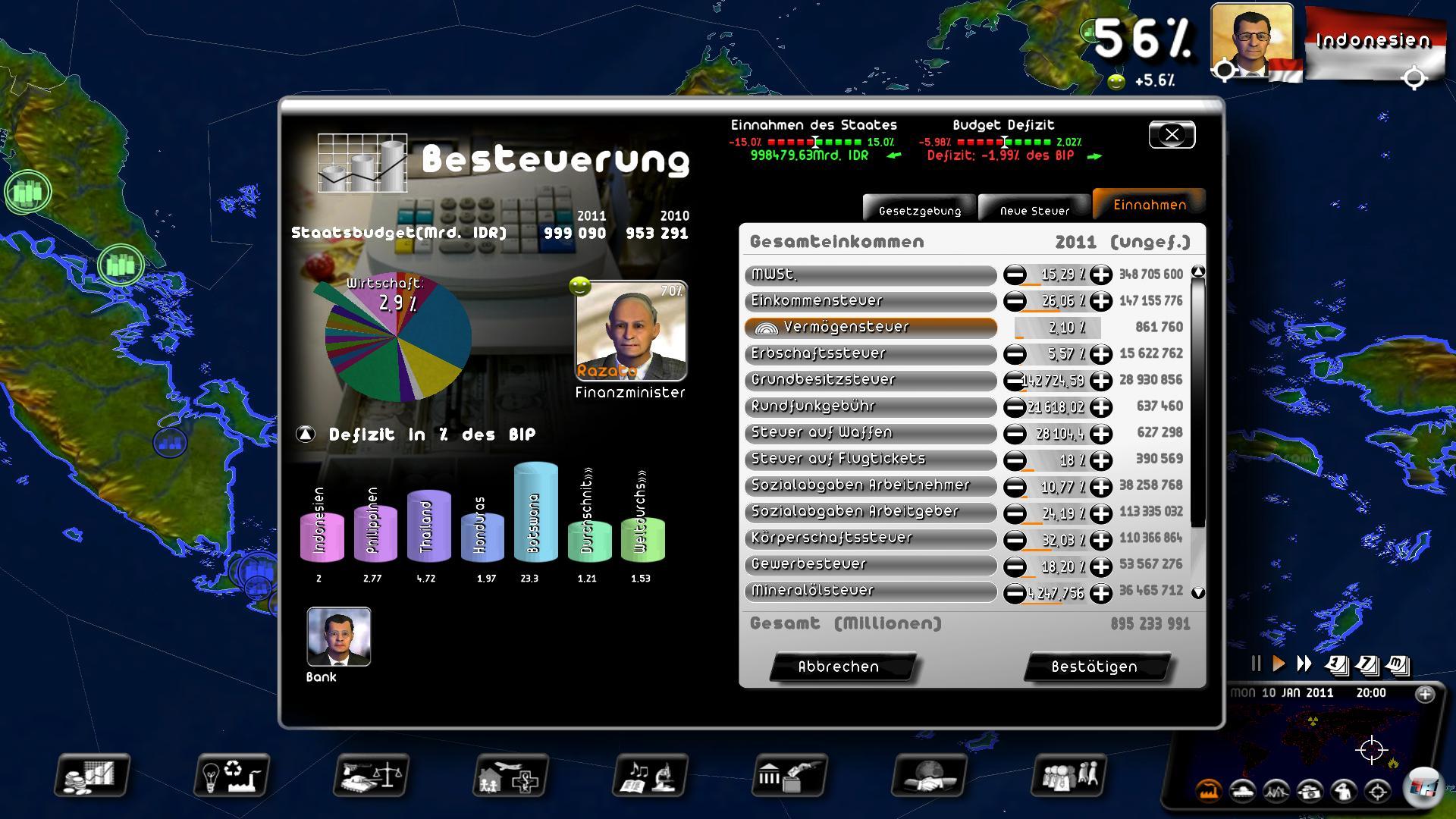 die aktuelle Weltpolitik im Groben und Ganzen darzustellen, wobei wichtige Probleme vorkommen. Die meisten spielbaren Länder sind heillos überschuldet, es geht um die Einführung des Mindestlohns oder die Vermögenssteuer zur Kontrolle der Finanzmärkte. All das lässt sich auch durch Gesetze regeln, deren Einführung nicht immer reibungslos läuft. Je nach Staatsform muss eine Vorlage erst das Parlament passieren, wofür man wie in Deutschland eine Mehrheit braucht. Man muss die Führer der jeweiligen Fraktion vorladen, um sie auf seine Seite zu ziehen. Das kann auch mit Bestechung geschehen, wobei es keine Garantie gibt, dass es klappt. Missverhalten kann leicht zum Fall eines Politikers führen, da die Umfragewerte sinken und man zum Rücktritt aufgefordert wird.
