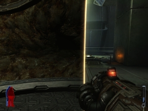 Einzigartig ist aber nicht nur die veränderliche Schwerkraft, beeindruckend sind vor allem die Portale. Dabei wirken die Durchgänge auf den ersten Blick völlig unspektakulär, aber gerade das ist so faszinierend. Denn auch wenn ihr schon in tausendundfünfzig Spielen von einem Ort zum nächsten transportiert wurdet: So nahtlos war der Übergang noch nie. Ihr seht schon von Weitem, was euch auf der gegenüberliegenden Seite erwartet, denn die Öffnungen geben den Blick auf das frei, was dahinter liegt. Ihr könnt sogar hindurch schießen. So erledigt ihr einige der Aliens, bevor sie das Feuer erwidern können. Tretet ihr schließlich über, gibt es kein Blitzen, kein Verschwinden und Anderswo-Wieder-Auftauchen. Ihr lauft wie durch eine Tür und seht jederzeit beide Räume – die Illusion ist perfekt.