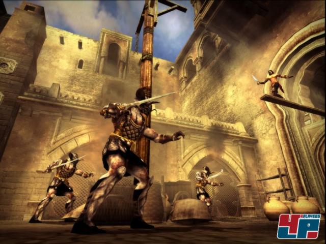 In den Auseinandersetzungen mit den bekannten Sandmonstern, Wachen, Bogenschützen und anderem Gesindel greift ihr auf ein großes Repertoire an stilvollen Moves zurück und deckt die Fieslinge entweder ein- oder beidhändig mit Säbelstichen oder Axtschlägen ein. Eine weitere Art, die Gegner vor allem schnell und lautlos zu beseitigen, sind die neuen Speed Kills: Dabei schleicht ihr euch zunächst langsam von hinten an die Feinde heran. Sobald der Bildschirm blinkt, leitet ihr den Angriff auf Knopfdruck ein. Danach ist perfektes Timing der Schlüssel zum Erfolg: In den vollkommen automatisch ablaufenden Bewegungsabfolgen blinkt der Dolch des Prinzen mehrmals auf. Genau dann gilt es, den Schlagen-Knopf zu drücken. Seid ihr zu langsam, müsst ihr dagegen in einem normalen Kampf antreten und zieht dabei vielleicht sogar die Aufmerksamkeit weiterer Wachen auf euch, die ihr ansonsten ebenfalls hättet lautlos beseitigen können. Zwar erscheinen die Speed Kills zu Beginn noch einfach, doch werdet ihr später mit verschiedenen Timing-Varianten konfrontiert, die blitzschnelle Reaktionen erfordern. Insgesamt erhält Prince of Persia damit einen leichten Splinter Cell-Ansatz, der jedoch einen guten Zwei- oder gar Gruppenkampf nicht ersetzen kann.
