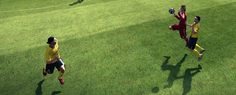Man kann aus dem Mittelfeld über weite Pässe oder schnelle Seitenwechsel erfolgreicher herausfinden, um dann in die Spitze zu spielen. Besonders lobenswert ist auf den ersten Blick das Laufverhalten der Mitspieler, das sich auch daran orientiert, wer gerade den Ball führt. Sprich: Wenn ein Regisseur das Leder Richtung gegnerische Hälfte treibt, dann bieten sich die Außen aktiver an als wenn sich z.B. ein Innenverteidiger nach vorne kämpft. Allerdings wird dieses System scheinbar nicht konsequent genutzt, denn manchmal versammeln sich zu viele Mitspieler auf Ballhöhe und es gibt keine eigenständige Bewegung der Offensivleute in die Spitze – es wäre klasse, wenn man per Druck auf eine Schultertaste auch Läufe in den freien Raum einleiten könnte. Trotzdem verblüfft die Rasanz auf dem Platz, die manchmal für positive Überraschung, aber auch für negatives Chaos sorgen kann: FIFA 10 ist langsamer und geordneter, während es hier für eine Simulation fast schon zu zügig hin und her geht.