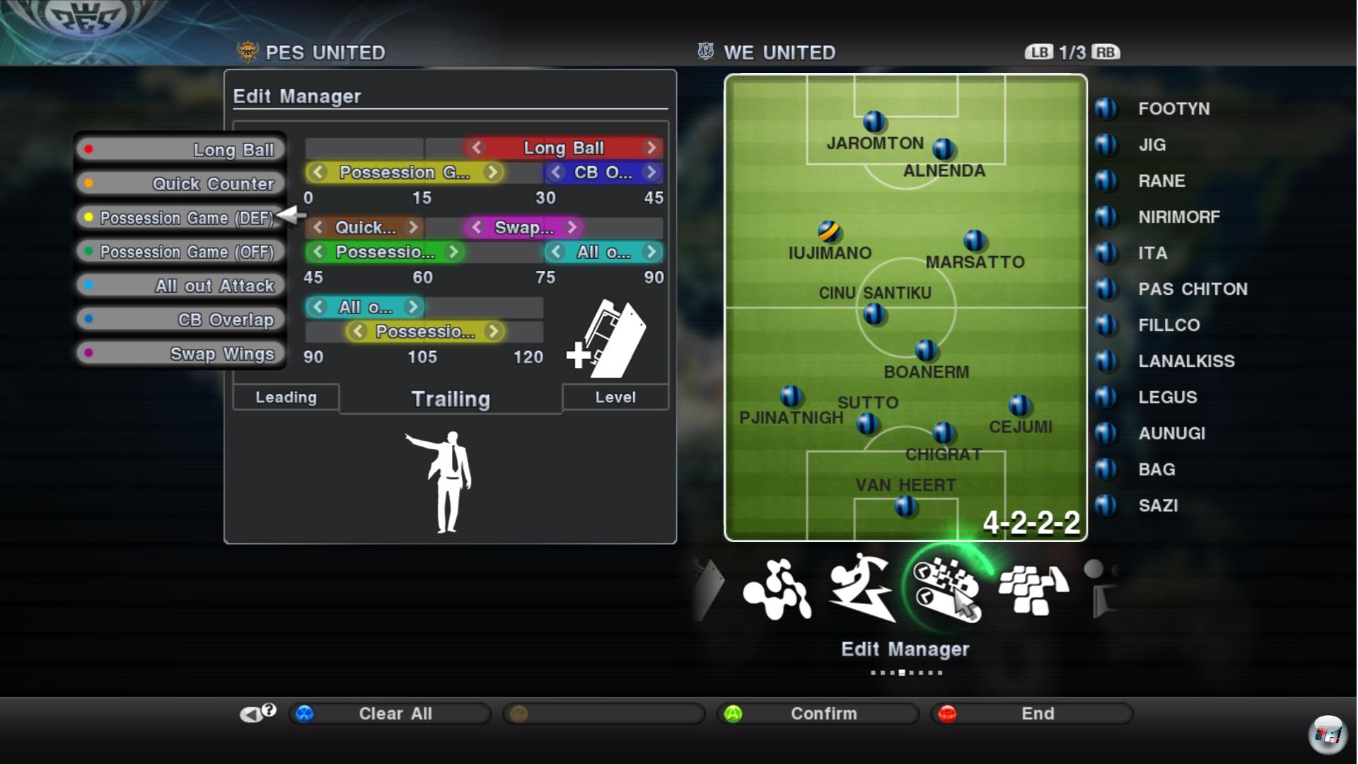 Apropos Laufwege und Offensiv-Verhalten: PES ist in den Tiefen der Aufstellung ein Eldorado für Positionsfetischisten und Strategiewechsel je nach Spielstand. Die neue Benutzeroberfläche ist zwar zunächst verwirrend, bietet Einsteigern aber schon vor dem Anpfiff, balancierte oder offensive Formationen an, die automatisch verwaltet werden – dann braucht man sich quasi um nichts kümmern. In diesen vorgefertigten Strategien wird festgelegt, wie sich ein Team bei einer Führung oder im Rückstand verhält. Auf dem Platz kann man dann sehr schön beobachten, wie sich Mannschaften im Raum zurückziehen oder nach vorne gehen.