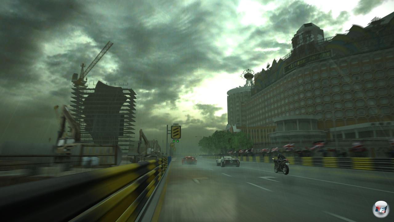 Sieht man sich die Kulissen und Fahrzeuge aus PGR 4 an, wird man auf den ersten Blick keine großen Unterschiede zum Vorgänger erkennen. Ein Beweis dafür, wie viel Bizarre Creations schon beim Launchtitel aus der Konsole rausgeholt hat. So könnt ihr auch hier wunderschöne, detaillierte Kulissen genießen, deren hohe Weitsicht nur ab und zu von vereinzelten Pop-Ups gestört wird. Vor allem die Wettereffekte – allen voran das düstere Gewitter – sorgen dafür, dass die Fahrten durch die Häuserschluchten mit spiegelnden Asphaltoberflächen einiges hermachen. Trotz dieser Effektorgie und der generell recht hohen Geschwindigkeit kommt das Geschehen nie ins Stottern. Die lizenzierten Fahrzeug- und Motorradmodelle stehen den aufwändig modellierten Kursen in nichts nach und glänzen ebenfalls mit vielen Details, tollen Spiegelungen und Cockpitansichten zum Verlieben, in denen ihr euch frei umsehen könnt. Neu hinzugekommen ist eine Motorhaubenansicht, aber mal ehrlich: Wer will bei diesen herrlichen Cockpit-Nachbildungen noch in einer anderen Perspektive fahren? Besitzer älterer Fernseher müssen jedoch aufpassen: PGR 4 läuft lediglich unter 60Hz. Macht euer Flimmerkasten das nicht mit, bleibt der Bildschirm dunkel.