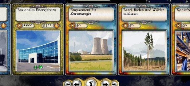 Dass in Projekt Erde trotz eher trockener Materie immer wieder Spaß aufblitzt, liegt am gekonnten Einsatz der Karten, die das A und O zur virtuellen Weltrettung sind. Es gibt eine Menge davon, sie kosten Spielgeld und sie intelligent zu spielen, ist eine Kunst, die man erst nach einigen Stunden versteht. Jede Karte hat Auswirkungen, die teils ihre Zeit brauchen. So dauert der Umstieg auf Elektroautos fünf Jahre, mindert aber auch den CO/2-Ausstoß. Es gibt Grundkarten, die man für weitere Karten braucht. Um Umweltkarten spielen zu können, braucht man erst ein Umweltbüro. Ebenso ist es mit Forschung, Sozialem oder Energie, die alle eine entsprechende Einrichtung benötigen.