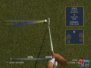 Montgomerie: Aber gerne. Zunächst einmal entscheidet man sich für einen Schläger und legt fest, wohin der Ball fliegen soll und wie man die Füße zum Ball stellt – das beeinflusst die Stärke des Dralls. Sobald Sie nun schlagen wollen, sehen Sie das Geschehen aus der Sicht des Golfers, können dann sogar den prüfenden Blick nach oben, also vom Schläger zum Ziel, ausführen. Jetzt kommt das Einzigartige: Für einen normalen Schuss müssen Sie nicht nur die Aushol- und Schlagbewegung mit dem linken Analogstick nachahmen, sondern verlagern mit dem rechten Stick auch Ihr Körpergewicht. Es reicht aber nicht, das Gewicht in die gewünschte Richtung zu bewegen. Vielmehr brauchen Sie eine gleichförmige Vor- und Rückwärtsbewegung. Es sei denn natürlich, der Ball soll besonders hoch oder flach geschlagen werden. Das lässt sich mit Variationen bei der Schwerpunktverlagerung erreichen. Zudem reicht es nicht, die Sticks einfach vor- und zurückzuziehen; die Bewegung simuliert das Timing eines echte Schlags sehr viel genauer als es die Konkurrenz tut.