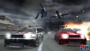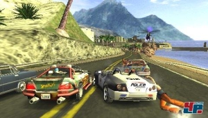 Die abwechslungsreiche Unterhaltung spiegelt sich auch in der schicken Kulisse wider, wenn ihr mal durch den Wald rast, mal die Wasserwege des Hafens durchpflügt oder auf den Highways von Capital City Gas gebt. Wasserfälle, Regenspritzer und satte Explosionen reizen die PSP voll aus – fordern aber auch mehr, als die Chips zulassen. Denn leider verlangsamt sich das Geschehen immer wieder zugunsten einer flüssigen Darstellung. Genauer gesagt kommt ihr kaum einen Kilometer weit, ohne nicht verschieden starke Einbrüche der Geschwindigkeit zu erleben. Schade, hier hätte ich gerne auf Details am Streckenrand zugunsten eines flotten Ablaufs verzichtet.