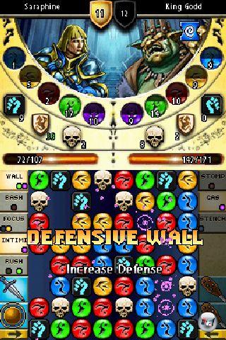 Im Gegenzug gibt sich die Entwicklung des Helden sehr nüchtern. Beim Waffenhändler genügt z.B. ein Klick auf die gewünschte Waffe und schon richtet sie mehr Schaden an. Voraussetzung ist, dass sich genug Geld im Rucksack befindet, in dem man übrigens schlecht wühlen kann, weil man nicht mit Schultertasten durch die Kategorien von Gegenständen schalten darf. Auf dem Point&Drück-DS spielt das natürlich keine Rolle. Abgesehen von den Händlern fällt den Entwicklern diesmal leider nichts weiter ein: Weder trainiere ich im zweiten Teil mein Reittier noch darf ich Städte einnehmen, Gegenstände schmieden oder meine heimatliche Zitadelle ausbauen. Dass ich unterwegs in Schatztruhen nach Geld und Ausrüstung wühlen kann, ist schon das höchste der Gefühle. War Puzzle Quest ein vergleichsweise umfangreiches Rollenspiel, ist sein Nachfolger nur noch ein flottes Action-Rollenspiel: dank seines Spielprinzips ungemein motivierend – ohne auch nur im Ansatz darüber hinaus zu gehen.