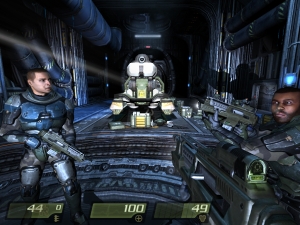 Optisch bietet Quake 4 genau das, was man mittlerweile von einem Spiel auf Basis der Doom 3-Engine erwarten kann: großartige Licht- und Schatteneffekte, sehr viel Dunkelheit, in der ihr euch per Taschenlampe Sicht verschaffen dürft, jede Menge metallische Gänge und Rohr-Konstrukte. Die Action spielt zum größten Teil innerhalb von Gebäuden, nur gelegentlich werdet