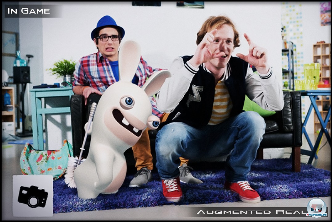 Zusätzlich kann man in einigen Minigames sowie unter „Mein Raving Rabbid“ Ubisofts Variante der „Augmented Reality“ kennenlernen. Was bedeutet das? Ganz einfach: Das Wohnzimmer wird zum Spielplatz und Aufenthaltsort der durchgeknallten Nager. Ähnlich wie in Sonys EyePet oder einer stark erweiterten Version des in der Remote lebenden Hasen aus Rabbids Go Home auf Wii kann man mit der virtuellen Figur agieren. Diese reagiert wiederum auf die Umgebungsgrenzen und die Bewegungen des Spielers vor dem Schirm.
