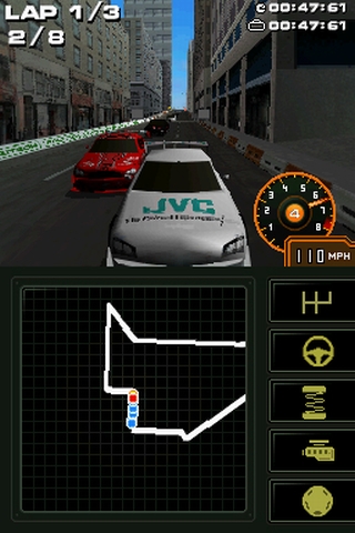 Das Schadensmodell fällt ebenfalls äußerst großzügig aus: Kollisionen mit euren Rivalen können eure robusten Flitzer nicht schocken. Nur wenn ihr eine unsanfte Bekanntschaft mit der Streckenbegrenzung macht, verfärben sich die Schadens-Symbole auf dem Touchscreen langsam aber sicher. Haben sie eine dunkelrote Farbe angenommen, lässt sich euer fahrbarer Untersatz deutlich schwerer navigieren. Ist z.B. die Lenkung beschädigt, müsst ihr gegensteuern, um die Spur zu halten, mit einer beschädigter Aufhängung kommt ihr schwerer um scharfe Kurven.