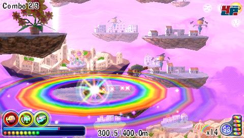 Wie im Original aus guten alten Tagen hüpft ihr auch diesmal von einer schwebenden Insel zur nächsten und so die über mehrere Bildschirme reichenden Levels empor. Um größere Abstände zu überbrücken schießt ihr immer noch mit Regenbögen, die sich für kurze Zeit als begehbarer Untergrund benutzen lassen. Die bunten Ringe eignen sich außerdem prima als Waffe, mit denen ihr neben euch befindliche Feinde über den Jordan schickt. Außerdem wurde das klassische Gerüst um eine Art dritte Dimension erweitert: Mit beweglichen Plattformen könnt ihr euch in zwei weitere Ebenen begeben, die hinter der vorderen liegen. Auch dort befinden sich Gegner, Extras und so weiter.
