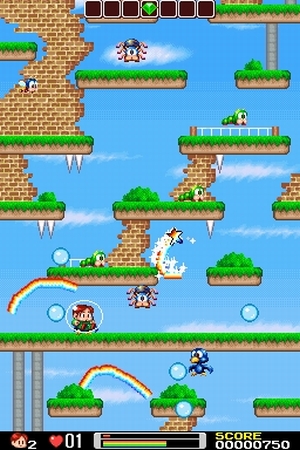 Somewhere over the rainbow& Taitos Rainbow Islands ist der direkte Nachfolger zum Klassiker Bubble Bobble – und obwohl es nie denselben Kultstatus erlangen konnte, hat es eine treue Fangemeinde, die sich bis heute an den kniffligen Geschicklichkeitspassagen und hart zu erreichenden Extras erfreuen. Wenn ihr euch jetzt auf ein zeitgemäßes Remake freut, werdet ihr gleich zweifach enttäuscht: Denn erstens bricht Rising Star Games mit der Serientradition, indem das Original nicht mit aufs Modul gepackt wurde. Zweitens haben sie das Spielprinzip gehörig umgekrempelt, indem sie die Steuerung komplett aufs Touchpad verfrachteten – das Ergebnis präsentiert sich als Mischung aus Yoshi Touch & Go <A class=DYNLINK onmouseover="DynToolTipp_Show('Klicken für Gameinfos‚)“ onmouseout=“DynToolTipp_Hide(); “ href=“javascript:DynCont_Display(‚Gamefinder‘,’runmod.php?sid={SID}&LAYOUT=dyncont_gf&spielid=6870′)“> Bunte Plattformwelten Ob Story- oder Score-Modus, überall warten sieben thematisch völlig unterschiedliche Welten mit je vier Levels und Endgegner. Außerdem dürft ihr auch im Mehrspielermodus gegeneinander antreten, allerdings braucht jeder der maximal vier Spieler ein eigenes Modul. Die Präsentation läuft Rising Star-typisch sehr simpel, aber in diesem Fall durchaus liebenswert ab: putzige Pixelfiguren düsen nett animiert durch die kunterbunten Welten, begleitet von tüdeliger Ufftata-Musik – nicht spektakulär, aber süß. Merkwürdig dagegen ist, dass man vom Spiel aus nicht zurück ins Hauptmenü kommt; dazu muss man entweder sterben oder den DS neu starten. | Fakten: – zwei Spielmodi Pro / Kontra: + intelligentes Spielprinzip – keine beiliegende Original-Version