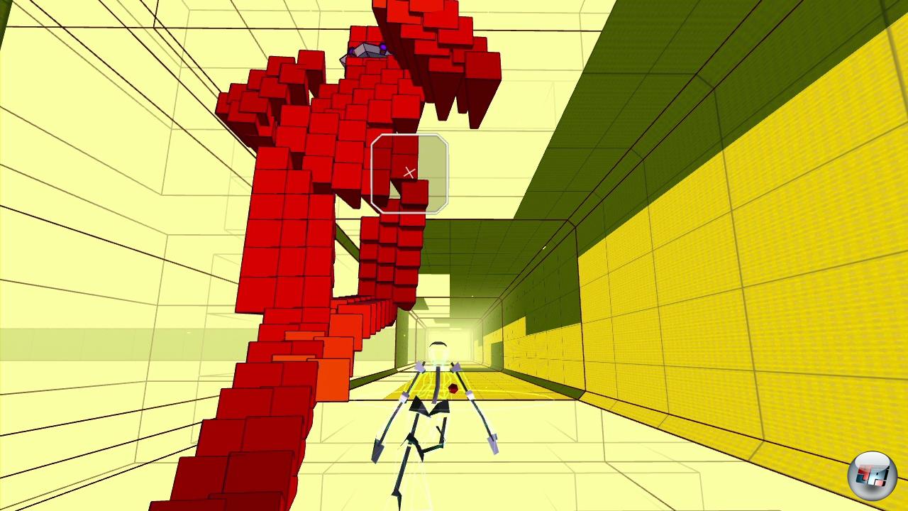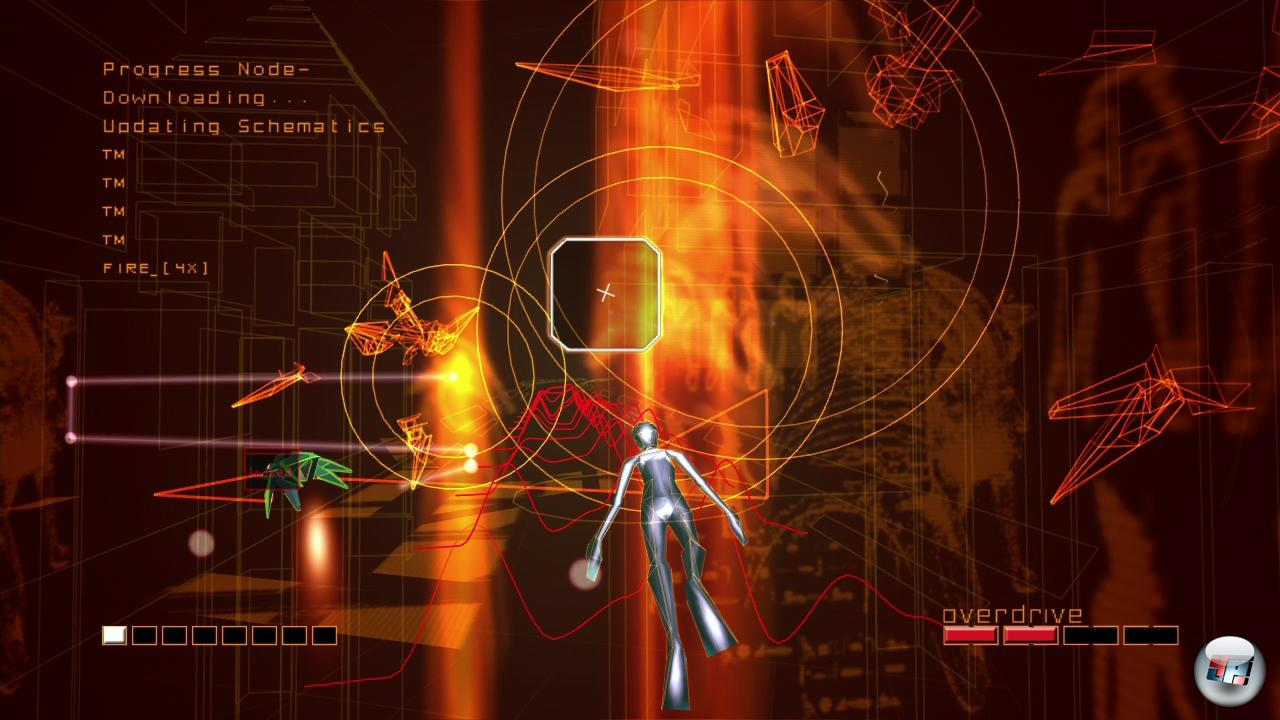 Aber zurück zum Spiel: Mit Rez wollte Tetsuya Mizuguchi alle Sinne gleichzeitig betören und hat deshalb die Grafik, den Soundtrack und den Rumble-Effekt möglichst genau aufeinander abgestimmt. Von Level zu Level gesellen sich mehr Instrumente zum treibenden elektronischen Soundtrack hinzu, der von bekannten Künstlern wie Ken Ishii für das Spiel komponiert wurde. Die futuristische Drahtgitter-Kulisse und eure abtrakten Widersacher pulsieren im Takt der Musik, das Pad vibriert mal rhytmisch, mal dramatisch stark, wenn Gefahr in Verzug ist.