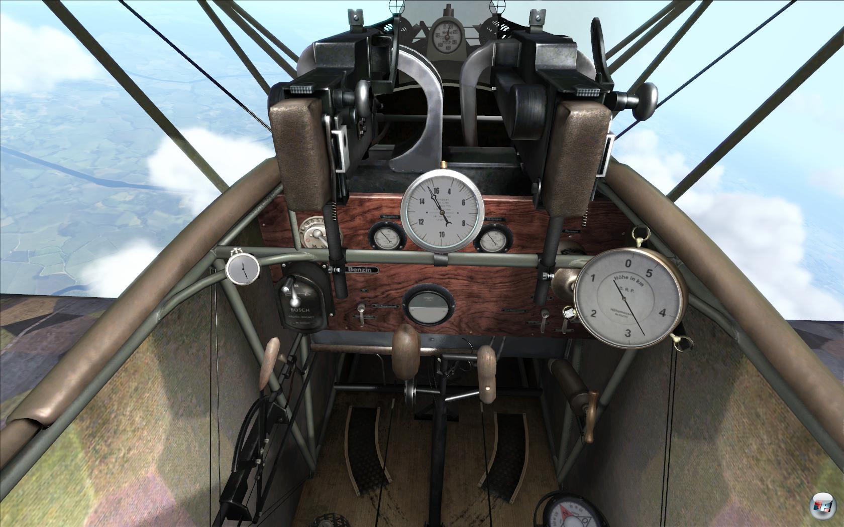 | Ein Blick in das Cockpit desselben Flugzeugtyps (Fokker D. VII): Alle Instrumente sind in Echtzeit ablesbar. |