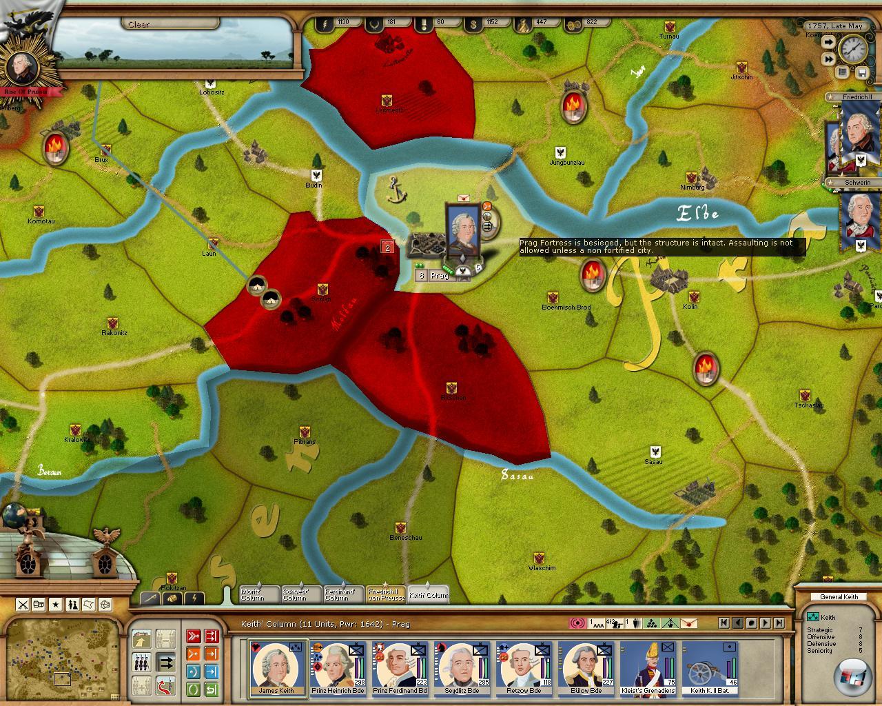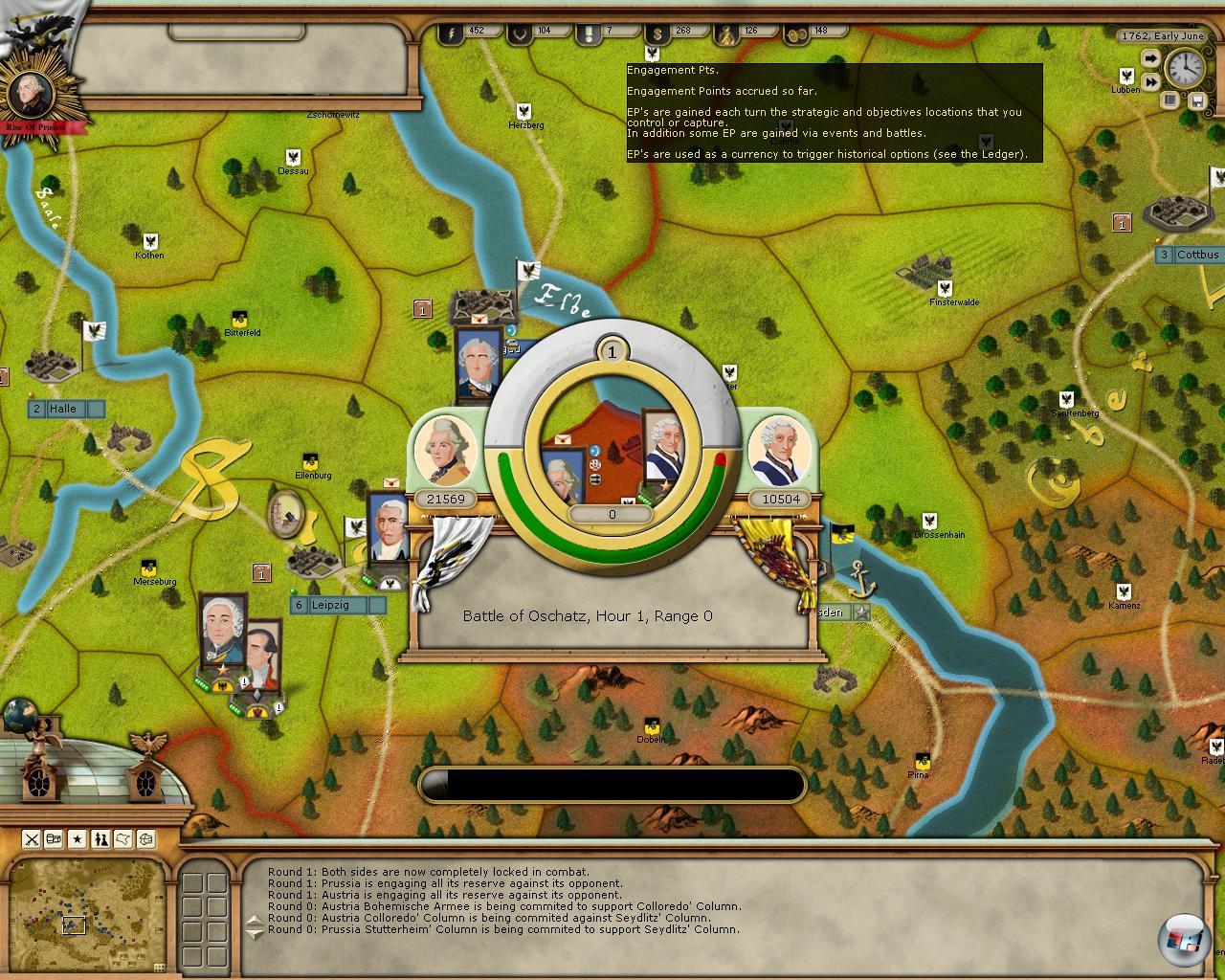 verstärkt, die so einen Durchbruch in der feindlichen Linie erzwingen soll. Zwar hat der Hohenzoller auch im Spiel spezielle Eigenschaften, die sich auf Offiziere und Mannschaften übergehen, die dann besser kämpfen, aber eine richtige Taktik ist nicht möglich. Zwar spielen Gelände, Witterung und Art der Truppen eine Rolle, aber man kann der Schlacht keine entscheidende Wendung geben. Wie bei Europa Universalis ist man stattdessen darauf angewiesen, alles im Voraus richtig zu machen, was in dem Datenwust fast unmöglich ist. Daher ist es unerlässlich, den Landstrich mit Kavallerie aufzuklären, damit man wenigstens weiß, wer anrückt – sonst läuft man irgendwann in eine Falle, aus der es kein Entrinnen gibt.