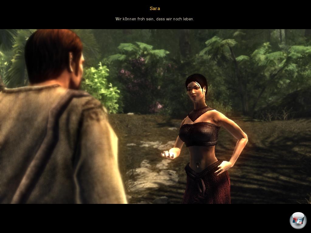 Der Held ist trotz Gedächntnisverlust und armseliger Ausrüstung noch reich an Tatendrag: Kaum erwacht, findet er eine bewusstlose Frau namens Sara. Ist die Dame nach der Flutwelle mutiert? Oder wie kommt es zu diesen seltsamen Proportionen im Vorbau? Müsste man nicht eine Kette am Top befestigen, damit es hält? Nichts gegen große Brüste, aber dann designt sie doch bitte so, dass sie wenigstens authentisch aussehen! Wie viele Frauen arbeiten denn bei Piranha als Grafiker? Hier beginnt jedenfalls das schwache Tutorial, denn die Lady gehört auch aufgrund ihrer blödsinnigen Kommentare zu den nervigsten Figuren der Spielegeschichte: „Schlag mich nicht!“ schreit sie eine nahende Stachelratte an und „Das war super!“ freut sie sich, wenn man einen Seegeier trifft. Wenn da zu Beginn ein rätselhafter Zauber war, dann ist er spätestens jetzt verflogen.
