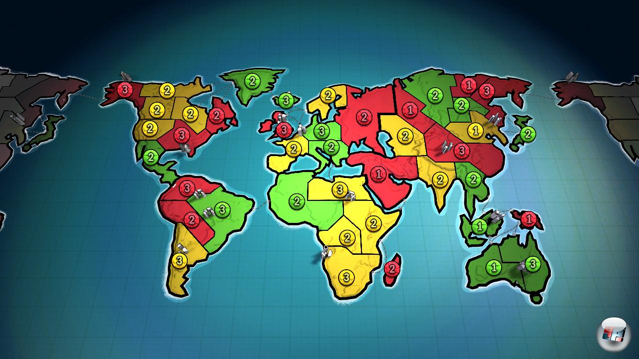 Insgesamt gibt es je nach Mitspielerzahl zwölf Landkarten, darunter natürlich auch die klassische Risiko-Weltkarte, die durch ihre Besonderheiten für jede Menge Spannung und Abwechslung sorgen. Bedienung und Navigation sind sehr handlich und wer’s eilig hat, kann auch die Würfelduelle in zwei Stufen beschleunigen. Selbst beim Missionsangebot kann man je nach bevorzugter Spiellänge aus entsprechenden Vorgaben wählen, die Startaufstellung manuell bestimmen oder dem Zufall überlassen sowie statt auf Missionen auf Welteroberung spielen. Dass es hingegen keine Möglichkeit gibt, die Spielstärke von KI-Gegnern festzulegen, ist allerdings sehr merkwürdig und vor allem für Leute, die gern auch mal allein spielen, ärgerlich.
