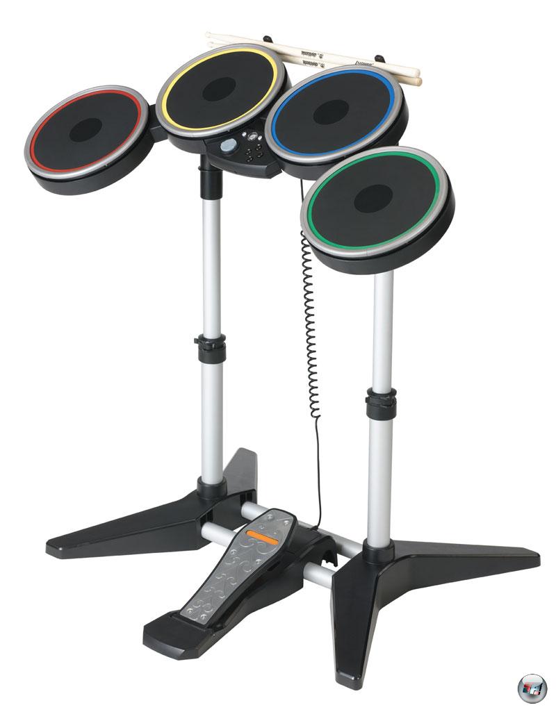 | … doch auch mit der „alten“ Klampfe macht es Spaß – und wer will, kann Rock Band 2 problemlos auch mit den Instrumenten der Konkurrenz-Serie spielen. |