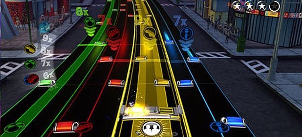 Im Gegensatz zu den großen Rock-Brüdern muss man hier nicht auf fünf spielbare Notenstränge achten, sondern kann sich auf zwei pro Spur konzentrieren. Die Noten werden in der Standardeinstellung über die Sticks aktiviert, während die Schultertasten die Spuren durchschalten. Es gibt noch drei weitere Konfigurationsoptionen (u.a. nur auf den Schultertasten), denen allerdings eines gemeinsam ist: Befindet man sich ganz rechts, kann man nicht direkt in die ganz linke Spur weiterrücken, sondern muss den Umweg über alle anderen Spuren gehen. Da der Zeitfaktor eine kritische Rolle spielen kann, ist dies ein unnötiges Ärgernis, dessen Ursprung ich nicht nachvollziehen kann.