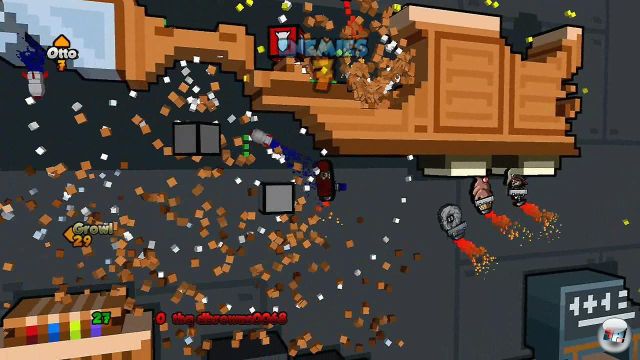 mit Raketen Jagd auf Gegner machen. Die in einem nostalgischen Pixelstil designten Schauplätze sind komplett zerstörbar und bergen in ihren sich langsam wieder regenerierenden Kulissen zahlreiche Power-Ups,
