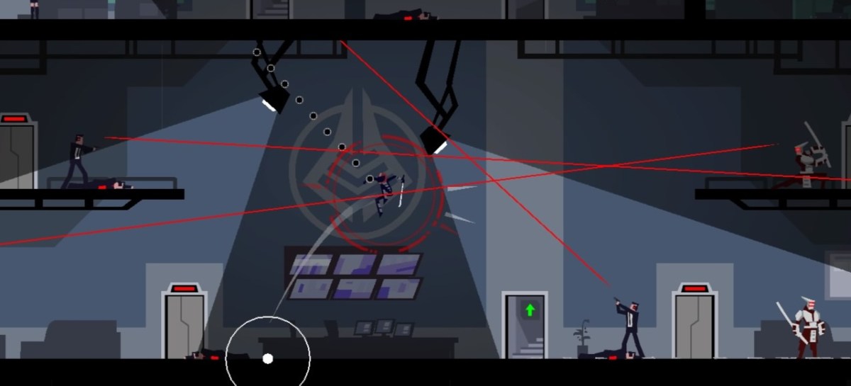 Und wie spielt es sich? Zunächst einmal bewegt man die rachsüchtige Protagonistin ganz gewohnt mit dem Analogstick, auch an Wänden und Decken entlang. Zeigt man mit dem rechten Stick allerdings eine Richtung an, springt sie genau dorthin. Ein Tastendruck ist nicht nötig. Genauer gesagt wird das Spiel angehalten, so lange man den Stick kippt, damit man den Sprungwinkel in Ruhe bestimmen kann. Ein wenig erinnert das an Gunpoint. Kein Wunder: Die Stealth-Action diente als Vorlage.