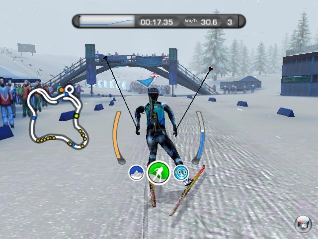 nach vorn. So funktioniert auch der normale Lauf, nur dass ihr den überwiegenden Teil des Rennens aufpassen müsst, in welchem Rhythmus ihr die Controller schwenkt: Seid ihr zu langsam, verliert euer Athlet an Fahrt, im umgekehrten Fall zehrt er von seinen begrenzten Kraftreserven. Der optimale Einsatz variiert dabei je nach Steigung des Geländes, so dass ihr gerade an starkem Gefälle eure Schwunganzeige genau im Blick halten müsst. Anders als im vergangenen Jahr auf PC und PS2 befindet sich diese neben eurem Sportler in der Mitte des Blickfelds – so könnt ihr endlich geradeaus schauen, während ihr über den Schnee gleitet. Apropos Gleiten: Geht es steil bergab, solltet ihr in die Hocke gehen, da ihr im normalen Lauf Zeit verliert. Und während des Schießens (zweimal pro Kurs) zielt ihr natürlich per Remote auf den Bildschirm, das Nachladen erfolgt per Analogstick.
