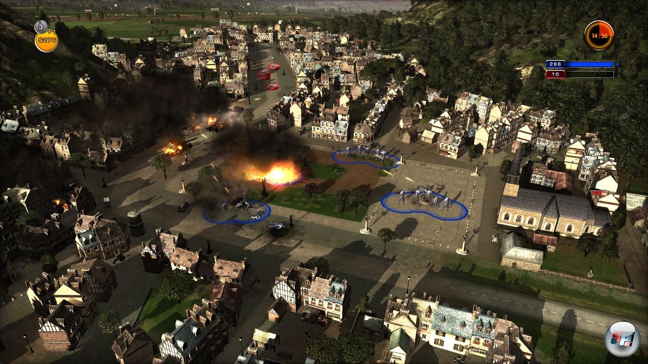 Auf PS3 und 360 muss man sich an die Steuerung zunächst gewöhnen, aber dann funktioniert sie bis auf eine Ausnahme ordentlich: Sichtbare Einheiten gleichen Typs kann man nicht über Doppeldruck aktivieren, sondern über einen Kreis, der sich nach Knopfdruck vom Zielpunkt ausweitet – so kann man zwar sechs dicht beieinander stehende leichte Panzer auswählen, aber eben nicht vier oder nur drei, denn es gibt kein Lasso zum Markieren. Gerade wenn es an einem Ort hitzig wird, weil Soldaten, Geschütze und Panzer aktiv sind, kann man mit dem Gamepad nur über mehrere Aktionen etwas Ruhe und Ordnung reinbringen. Trotzdem kann man mit etwas Geduld auch von der Couch aus seine Verbände kontrollieren, indem man frühzeitig Gruppen einteilt.